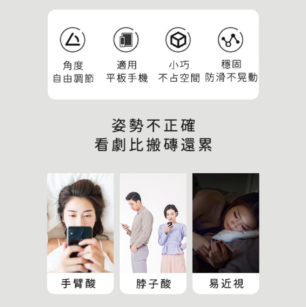 這款手機平板桌面支架具有四大特色,分別是角度自由調節、適用手機或平板、小巧不占空間以及穩固防滑不晃動,而這四大特色能讓使用者以更正確的姿勢來觀看手機、平板,進而減少手臂痠、脖子痠、近視發生的可能性。