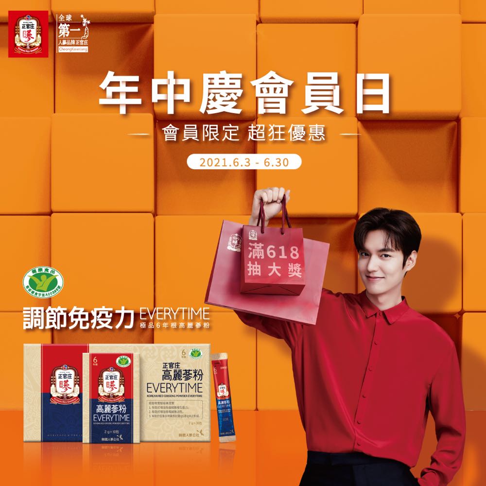 即日起至 6/30,如果在正官庄官方購物網單筆消費滿 NT$618 元就能享有免運優惠,另外還有加碼好禮包括 LINE POINTS 1,000 點、清爽自在提升代謝的 GoodBASE 高麗蔘百香飲等大獎提供給消費者抽獎。並推出誠意滿額禮,消費滿 NT$3,200 元贈路易莎咖啡商品券乙張、滿 NT$6,200 元即贈高麗蔘百香飲 10 入、滿 NT$9,800 元還有窈窕纖美麗的蔘纖凍 10 入。最後,正官庄官方購物網再祭出「轉轉樂卡位戰」,超狂轉盤最高送出 NT$618 元購物金!