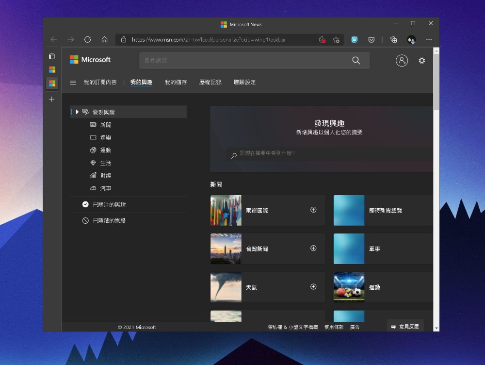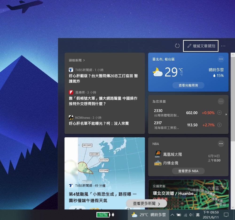 當然,你也可以在修改「新聞和興趣」呈現的資訊。將滑鼠移到工具列上的天氣圖示,並開啟彈出視窗的右上角「增加文章類別」,在發現興趣的欄位中,可將有興趣的資訊添加至版位中。