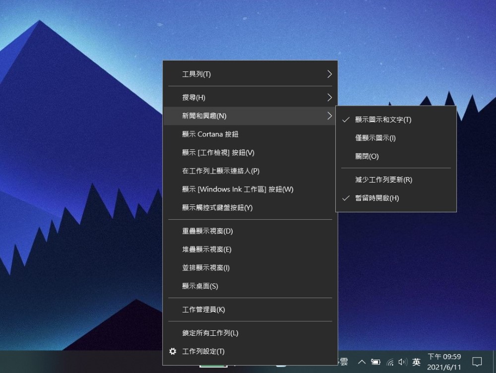 關閉 Windows 10 工具列上的「新聞和興趣」: