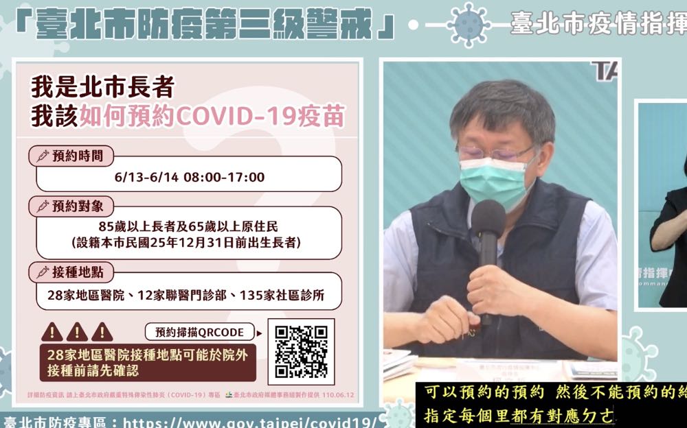 根據台北市長柯文哲表示,設籍台北市 85 歲以上長者以及 65 歲以上原住民,將能在 13 日、14 日兩天的 8:00 – 17:00 於「新冠肺炎 COVID-19 疫苗接種預約系統」官網進行預約。