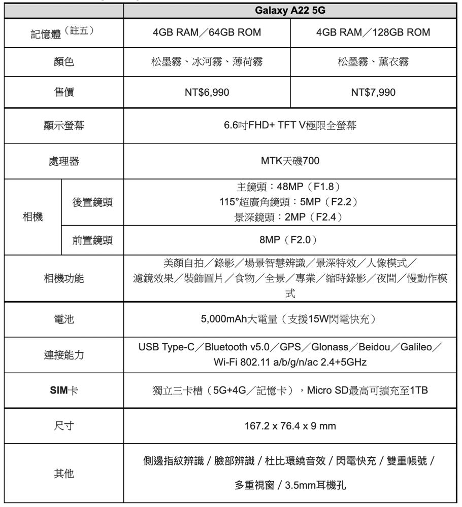 三星 Galaxy A22 5G 規格方面搭載 6.6 吋 V 極限全螢幕、90Hz 螢幕更新率、MTK 天璣 700 處理器、4GB RAM、64GB/128GB 兩種容量、4800 萬畫素(F1.8) 主相機 + 500 萬畫素 (F2.2)超廣角鏡頭 + 200 萬畫素 (F2.4)景深鏡頭、 800 萬畫素主鏡頭以及 5,000mAh 電池容量。