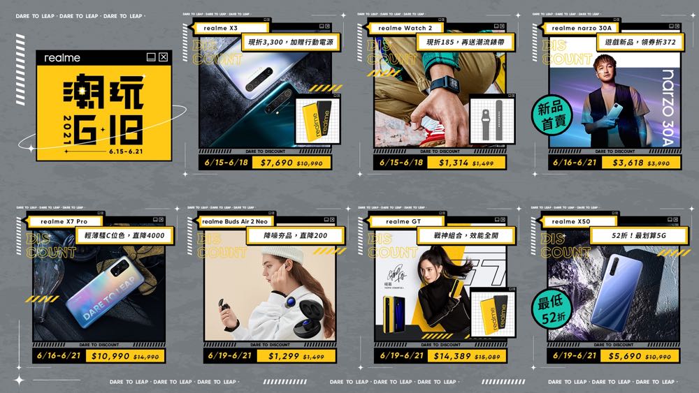 為感謝 real 迷 2021 上半年的支持與陪伴,realme 於 6 月 19 日推出加碼優惠,realme X50 不計本下殺 52 折,以 5,690 元震撼價回饋給想要入手 5G 手機的用戶們,此外,驚喜再推新機和行動電源限定超值組合,購買 realme narzo 30A 加購 10000 realme 快充行動電源 2 現省 200 元,僅需 4,289 元;購入全速戰神 realme GT 加購 10000 realme 30W Dart 閃充行動電源再省 700 元 ,14,389 元超值擁有,如果是觀望穿戴產品的用戶們也不要錯過返場機會,realme Buds Air 2 Neo 現折 200 元,優惠價 1,299 元;realme Watch S Pro 下殺 200 元再贈潮流錶帶(隨機出貨不挑色),折扣價 3,799 元,更多不容錯過的驚喜好康就在 realme 網路商店!
