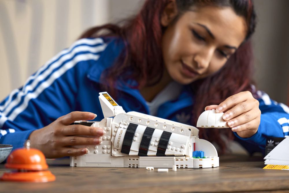 本次推出的樂高版 adidas Originals Superstar 盒組,經典重現實鞋特色,無論是鞋子的圖案、貝殼鞋頭、三葉標誌與鋸齒三條紋無一不是用樂高零件組成,更可透過盒組內額外附加零件,自行選擇拼砌左腳或右腳,更特別設計將此款樂高模型裝至鞋盒裡,增加整體趣味度的擬真感。