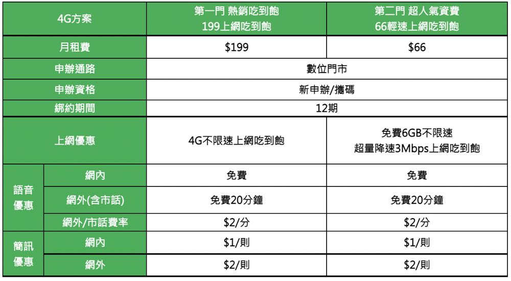 身份,新申辦和攜碼用戶均可申請。此外,凡成功申辦 199 元方案者,不用序號,沒有額外門檻,再享第二門 618 電商大促獨享資費 4G 輕速上網吃到飽,月租只要 66 元優惠,加碼再送 6GB 不限速上網流量。