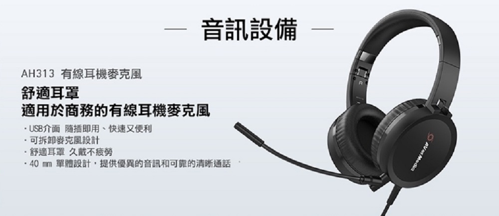 耳機則是採用 AH313 有線耳機麥克風,這組耳機的耳罩採舒適設計,即使久戴也不會造成太大的疲勞,再加上麥克風採可拆式設計以及具備 40mm 單體,工作或學習之餘想聽個音樂、追劇、玩遊戲也適用,輕鬆滿足工作及娛樂的需求。