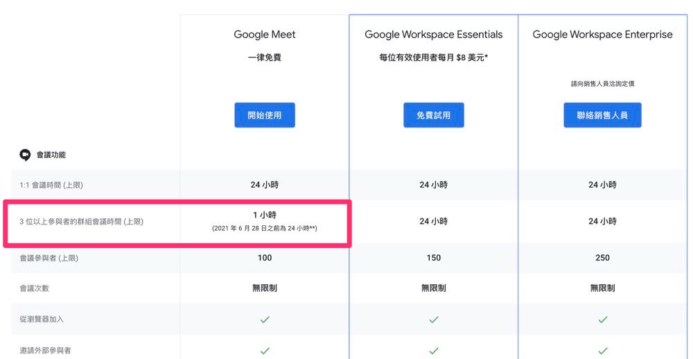 Google Meet 6 月 28 日起 3 人以上免費視訊調整回上限 1 小時!