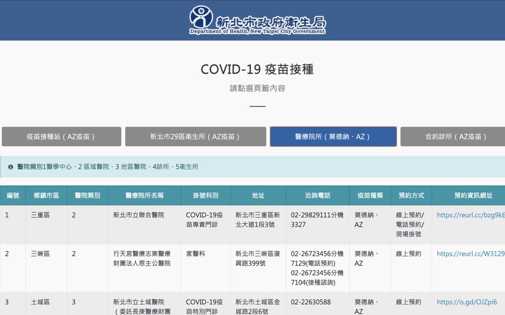 首先新北市民眾可以前往新北市政府衛生局 COVID-19 疫苗接種官網,有分為「疫苗接種站 AZ 疫苗」、「新北市 29 區衛生所(AZ 疫苗)」、「醫療院所(莫德納、AZ)」、「合約診所(AZ 疫苗)」四類,民眾可以選擇自己需要的醫療院所和疫苗種類來選擇。