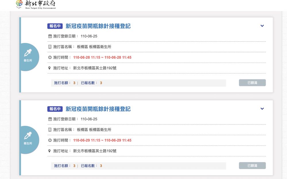 。「新北市 29 區衛生所(AZ 疫苗)」共有 29 所,也都有提供線上預約連結;