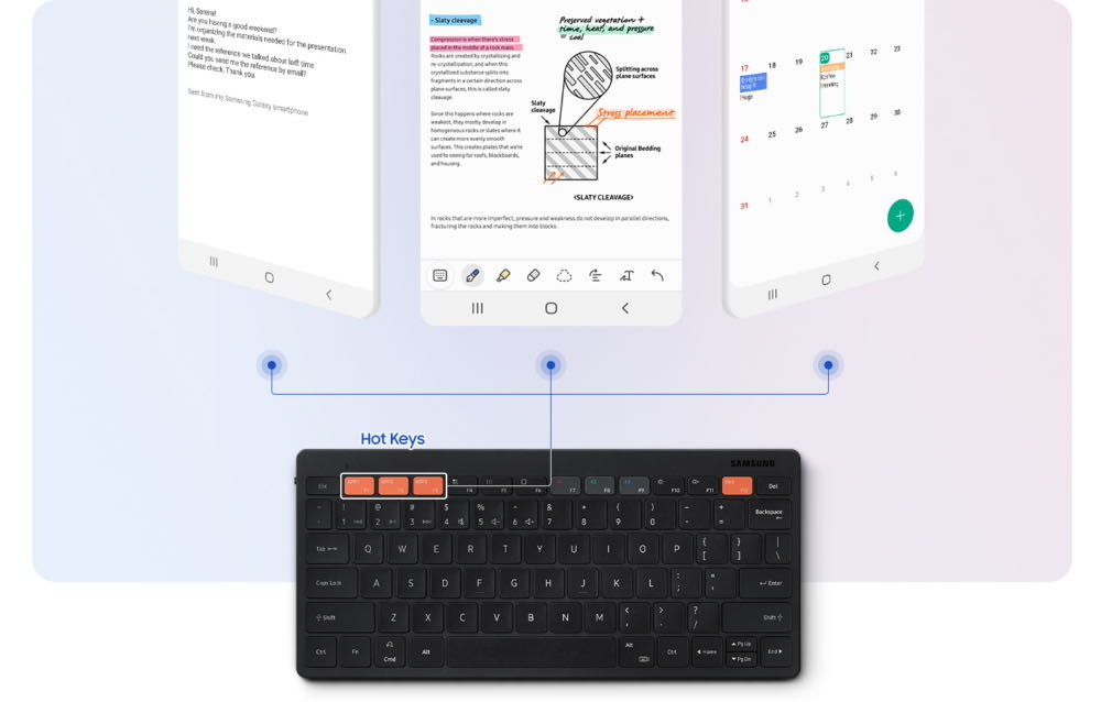 三星原廠多工藍牙鍵盤 Trio 500 在彈指之間,即能完成設定並安全連接其他裝置。僅需開啟鍵盤並長按藍牙鍵,裝置螢幕即跳出通知。接著,輕觸「連接」,輸入螢幕上顯示的六位數代碼便大功告成。它可以透過藍牙同時連接至多三種不同裝置,而且只要按一下按鍵就能在裝置之間輕鬆切換,多工處理簡單自如。假設用戶在使用筆記型電腦輸入筆記的同時,需要立即回覆智慧型手機的訊息,即可輕鬆切換操作中的裝置。
