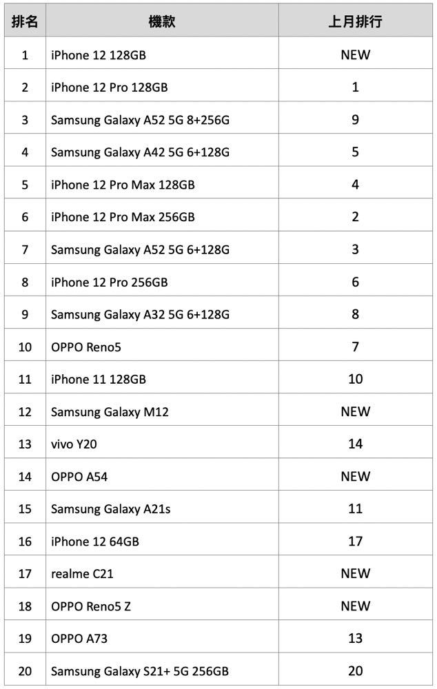 除了重新回歸的 iPhone 12 128GB ,在 4 月底上市的三星 Galaxy M12 大電量 4G 手機也是相當爭氣的一進榜就站上 12 名,OPPO A54、realme C21、OPPO Reno5 Z 都是新上市與具有高 CP 值特色的機種。