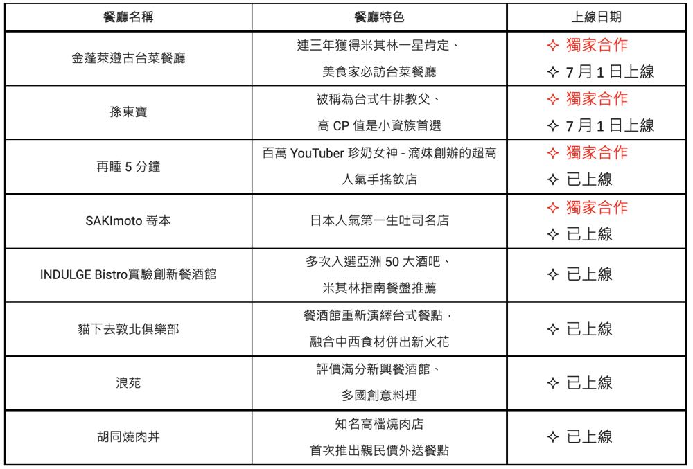台式牛排教父之稱「孫東寶台式牛排」,以往大排長龍的名店,現在不需排隊,只要一鍵就能即時將美味送到家。此外還有享譽國際的餐酒館、創意台菜美食、日式燒肉料理等多家人氣質感好店新上線,滿足饕客的口腹之慾,恣意享受專屬講究的好食光。