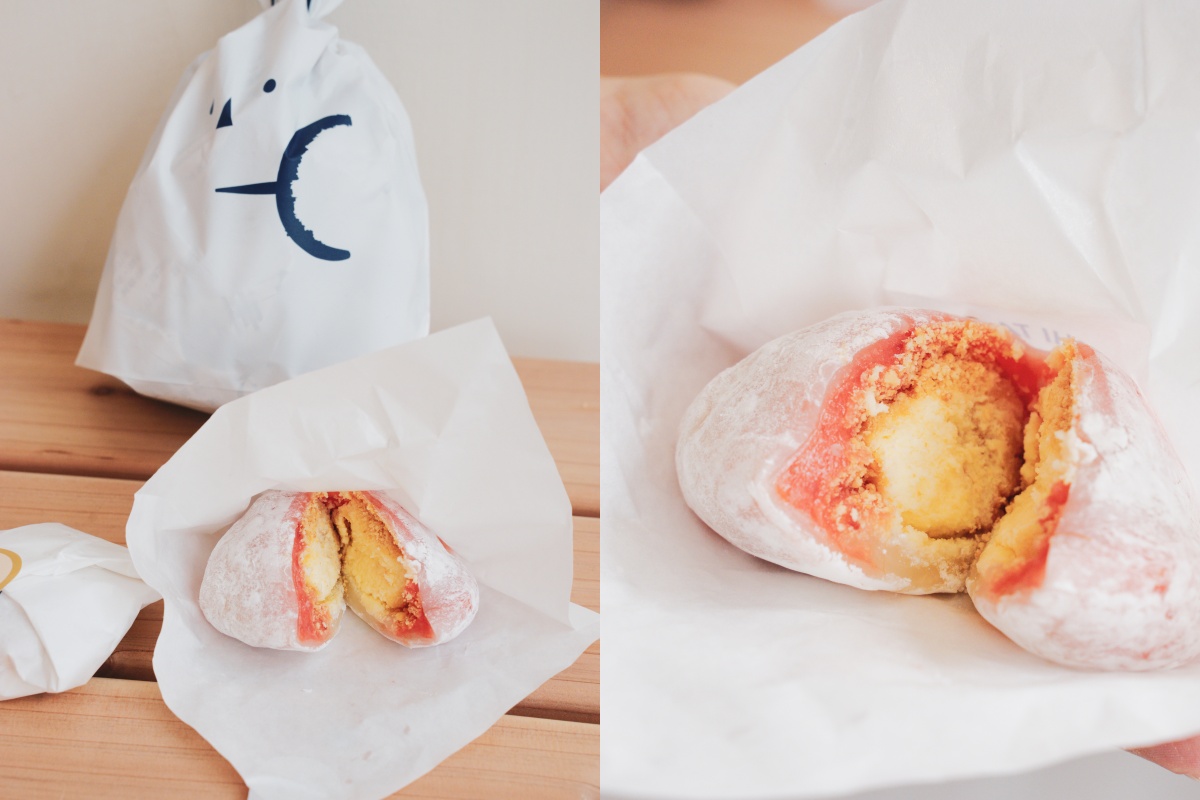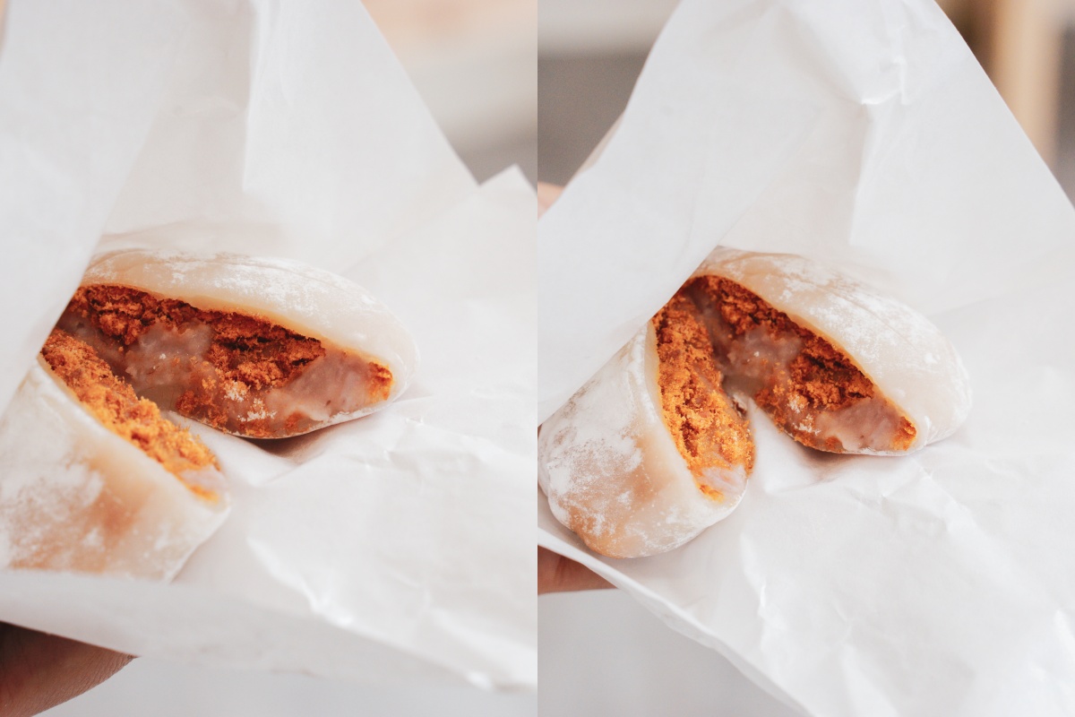 如果是喜歡甜食的人,那一定不能錯過提拉米蘇(手比愛心)。一入口就能感受到米玥麻糬堂的用心,因為這款口味掌握了提拉米蘇的口感的精髓,吃了就知道!喜歡鹹口味的人很推薦吃老派脯花生菜,裡面有菜脯和花生,鹹香鹹香的,讓人忍不住一口接一口。