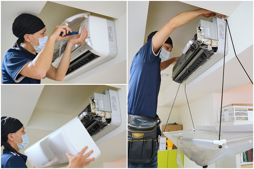 ▼一開始先清洗的是主臥室的Panasonic冷暖冷氣,拆機後技師會特別將電路板包起來,就不用擔心會碰到水而短路或壞掉;另外也會掛上特製的防水罩,就不用擔心清洗的時候會噴的到處都是,給人一種專業又安心的感覺!