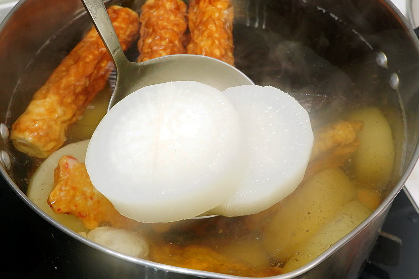 ▼接著將白蘿蔔放入關東煮湯底內繼續烹煮,再依序放入其他食材!