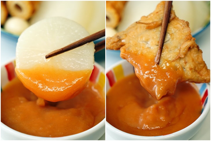▼食材吃起來都非常入味,單吃就帶點清甜口感,搭配醬料更是提味好吃,整個超級涮嘴~~讓人忍不住一口接一口,醬料記得留一點下來,可以加入關東煮高湯裡頭一起喝,有點類似肉圓吃完剩餘醬料再淋上高湯的吃法,喝起來滋味更加豐厚多層次,好好喝啊!