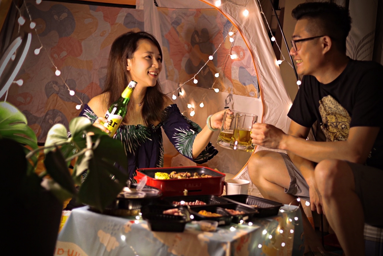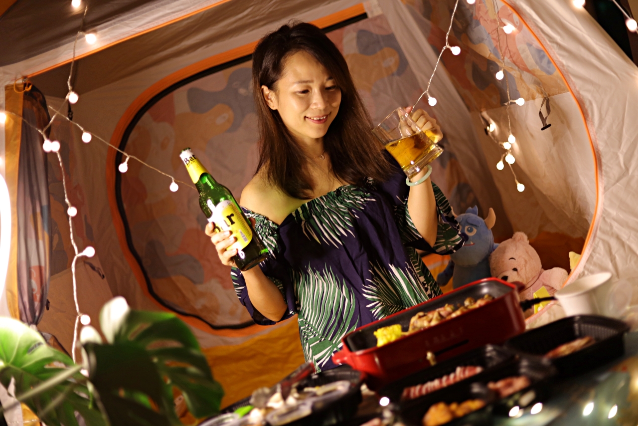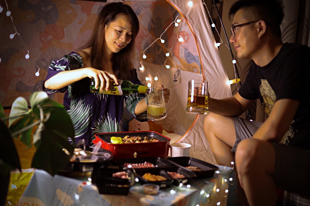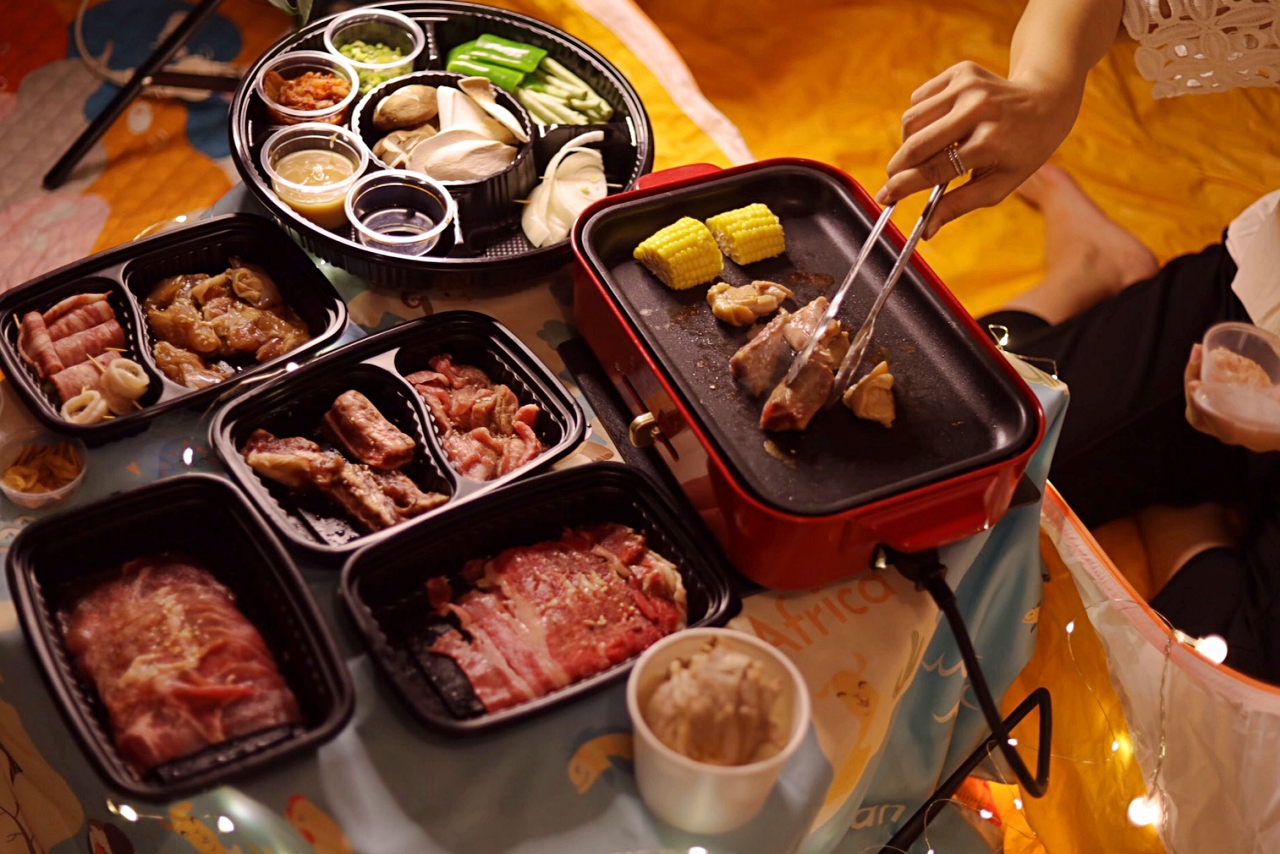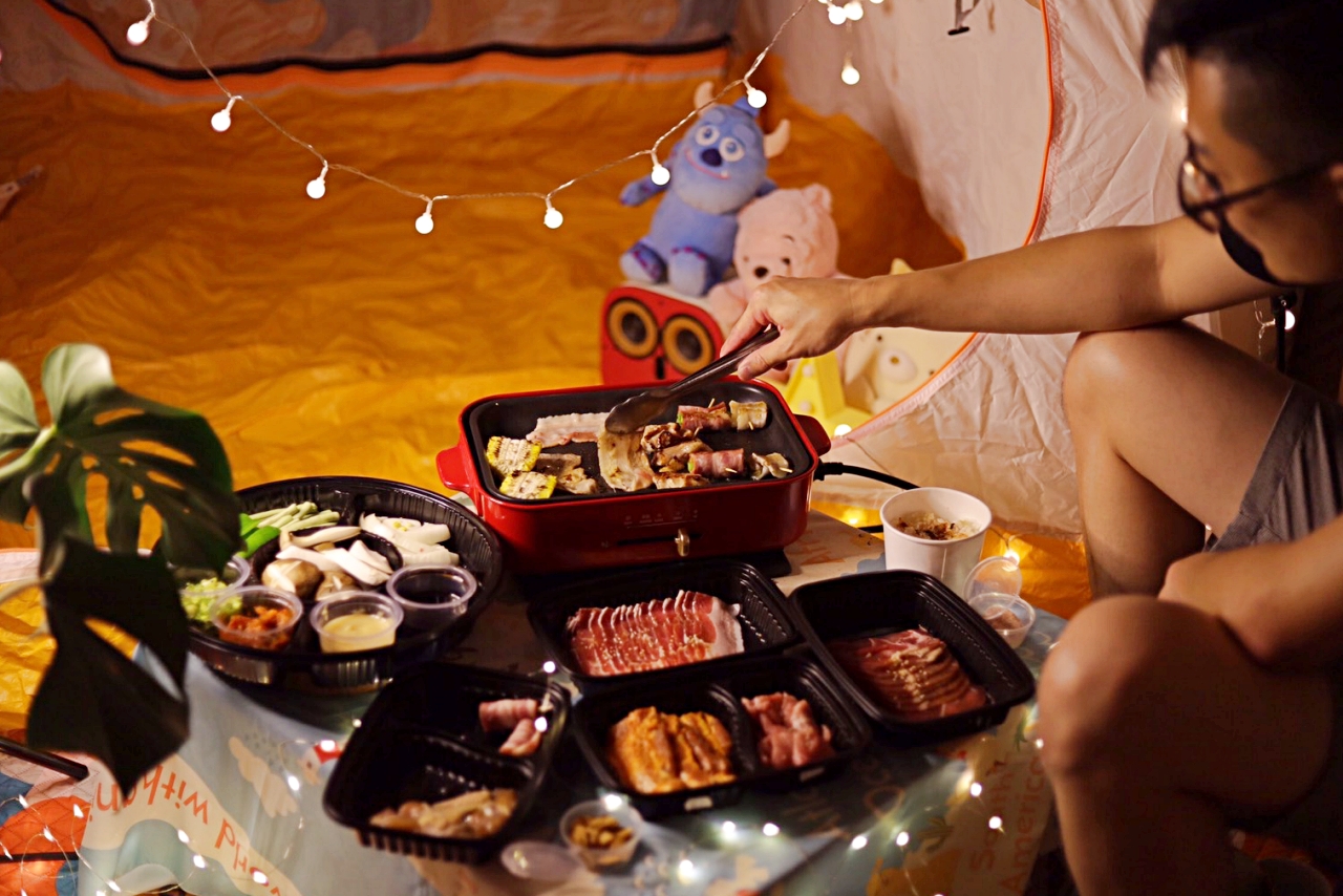 WFH久了,開始講究生活美學(其實是悶壞了),我們把帳篷、野餐墊放到客廳一角,掛上夢幻小燈條,稍微佈置一下像是在戶外野餐,然後訂了住家附近的Oh ! Yaki 日式精緻炭火燒肉外送套組,超狂的是連烤盤都有(天啊!是我好想要的BRUNO電烤盤),搭配店內超人氣肉品,準備好度假心情,享受夢幻的一餐。