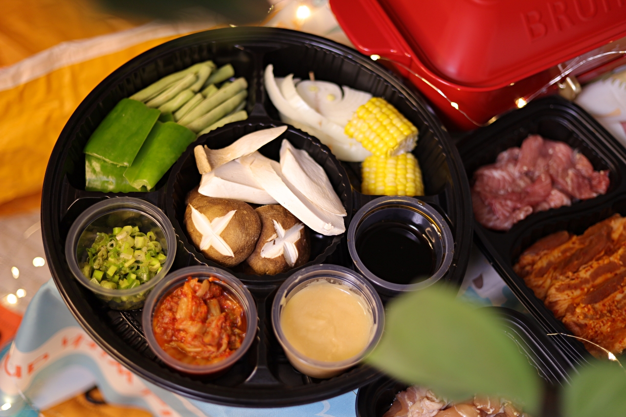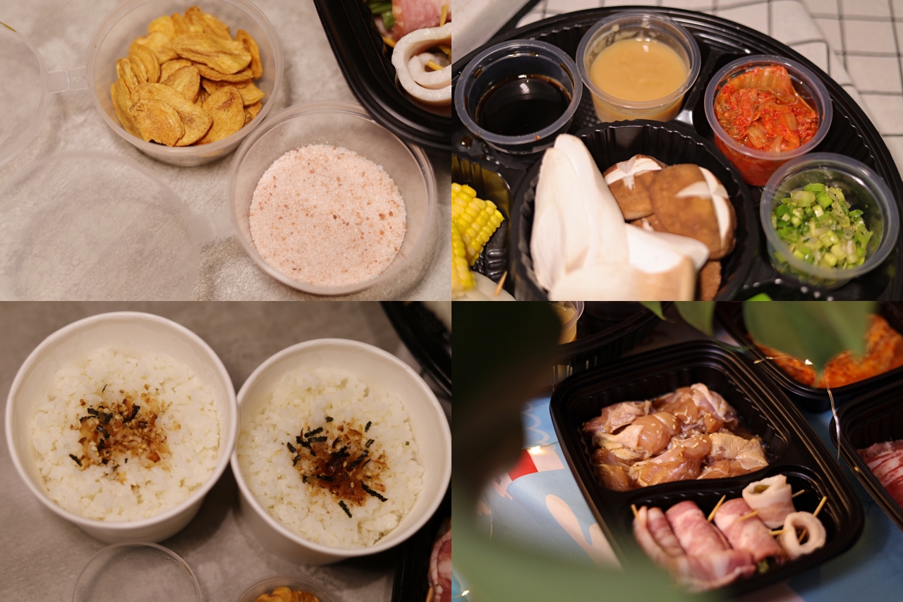 三種套餐包含這些基本副食、蔬菜拼盤、白飯,還提供泡菜、蔥鹽、味增醬、日式醬油、海鹽、蒜片,雖然是外送美食,細節完全不馬虎。吃肉也要配菜,這個蔬菜盤剛好平衡了烤肉油膩感,實在好吃咧。蔬菜種類多樣,有香菇、洋蔥、青椒、玉米、杏鮑菇、四季豆。