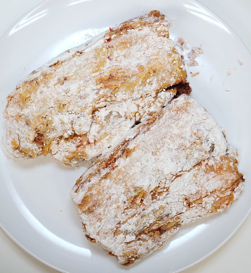 ▼將醃好的紅糟肉拿出來稍微瀝乾後,正反面都要均勻沾附地瓜粉(或樹薯粉、酥炸粉都可)!