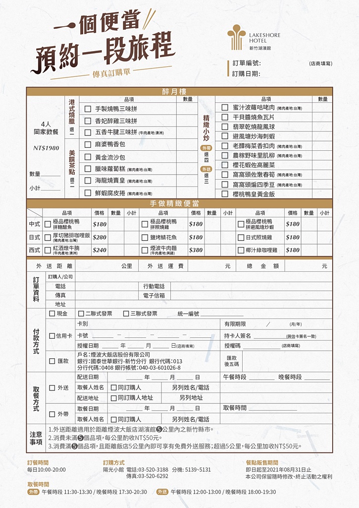 外帶餐盒、外送服務皆提供現場現金/刷卡支付,亦可提前匯款
