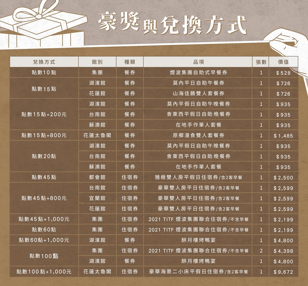 點數可跨館累積,累積達10點以上可換煙波集團餐券、住宿券等好禮,數量有限、換完為止唷!