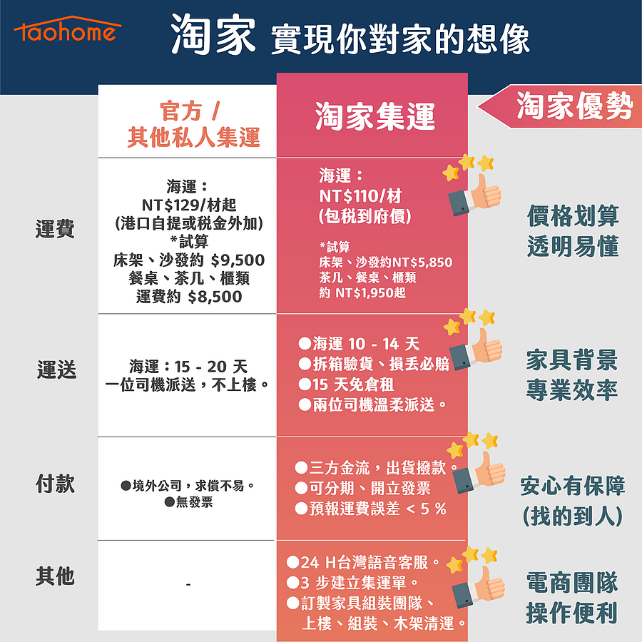 ▲在淘寶買家具真的會淘家具淘上癮,淘寶加上淘家集運真的是完美組合,以上則是淘家集運的超多優點。