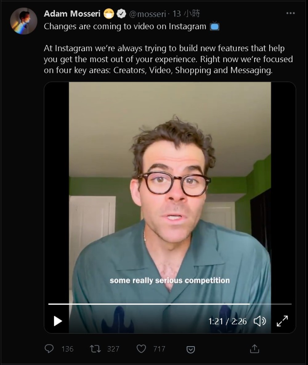 另外,Mosseri 也在影片中指出,IG 除了朝影音發展,平臺將更關注創作者、購物、訊息功能等三大面向。他說:「人們希望在 Instagram 上得到娛樂,但競爭很激烈,(我們)還有很多事情要做。」、「我們必須坦然接受,這意味著改變。」