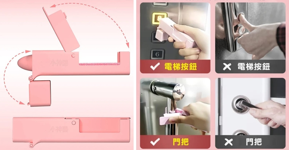 這款防疫神器能夠代替雙手去接觸日常的公用設施,比如前端筆尖設計可以用來按電梯、電動門的開關;後方的開蓋設計能夠變為「夾子」的形狀,就可以用來夾住門把、抽屜等使用,避免手直接碰觸。此外,內附海綿的小巧思,可以加入酒精或消毒水,避免接觸的同時還能再做一次消毒,保護自己也保護大家。