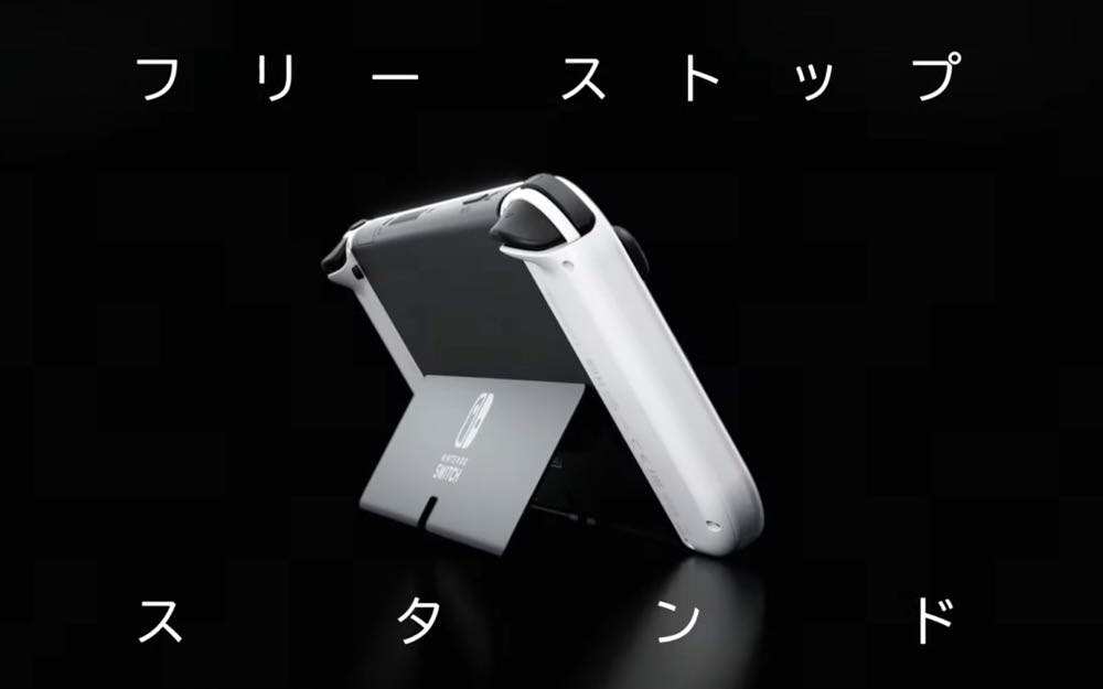 背面支架採用能自由調節角度的轉軸式設計,相較於 6.2 吋版本的 Nintendo Switch 背後那小小的支架,Nintendo Switch(OLED 款式)背面支架改成了整片式的設計,也讓玩家豎起的角度能更寬廣也更穩定,跟好友分享控制器後還能以桌上模式來穩穩的進行對戰或協力遊玩。