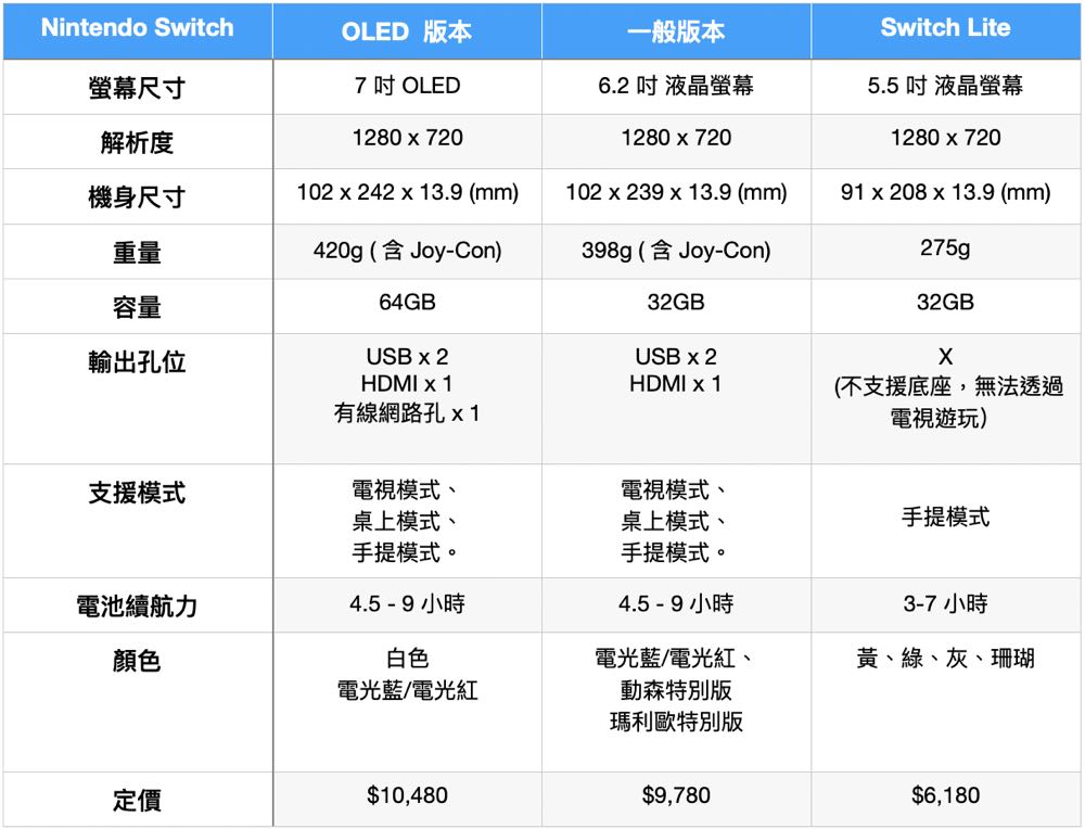 首先我們可以知道 Nintendo Switch 家族中共有即將推出的 OLED 版本、目前的一般版本與多彩輕巧的 Lite 三種版本,這三種最明顯的差異分別在:
