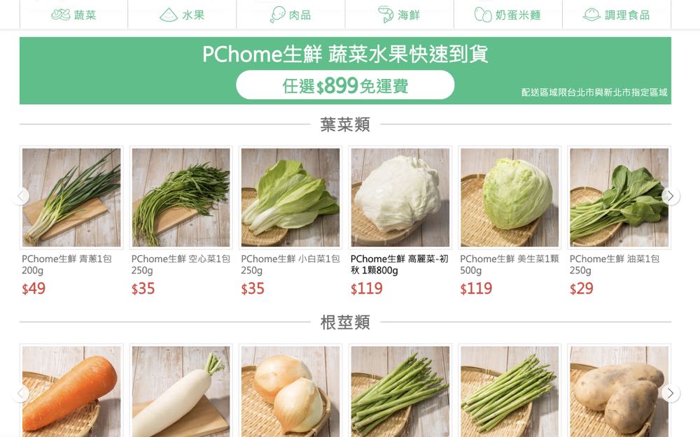 想要找到 PChome 24h 購物生鮮蔬菜箱並不難,只要在首頁的「食品」專區中進去,然後旁邊就有著 「PChome生鮮」的欄位,點進去後彷若進入了食材區的世外桃源,不只有豐富的蔬菜品項,連雞蛋、水果、肉品、海鮮等各種食材都能開始盡情挑選。