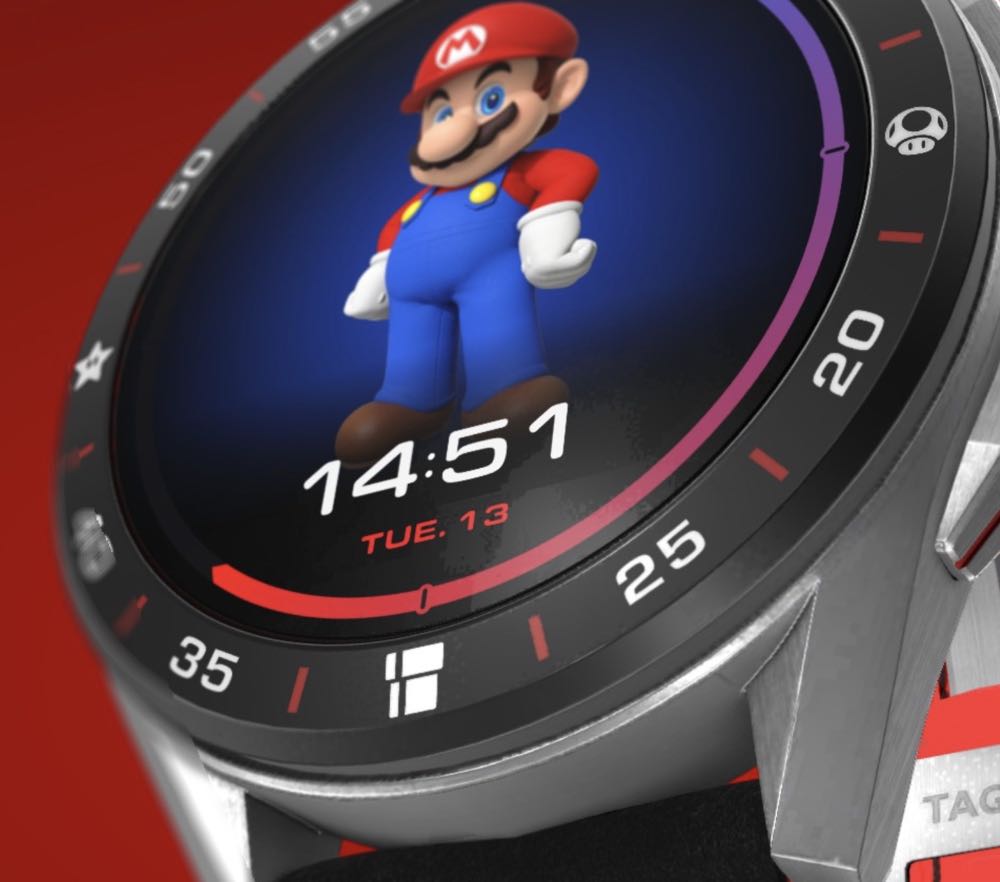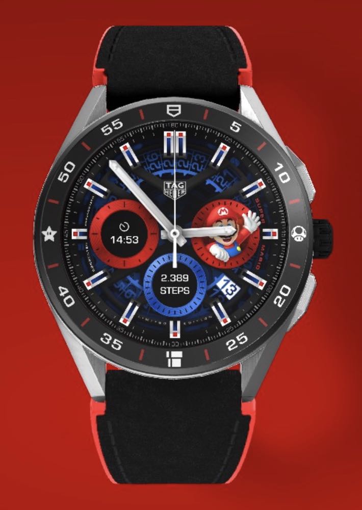 瑪利歐 TAG Heuer Connected 智慧型手錶採用 1.39 吋 OLED 藍寶石玻璃材質螢幕、也結合 Wear OS from Google 的服務,所以像是訊息、郵件、天氣、通知等,包括跑步、游泳、單車、步行、健身等運動紀錄都能使用,還有支援防水、GPS、心率偵測、 430mAh 電池容量。