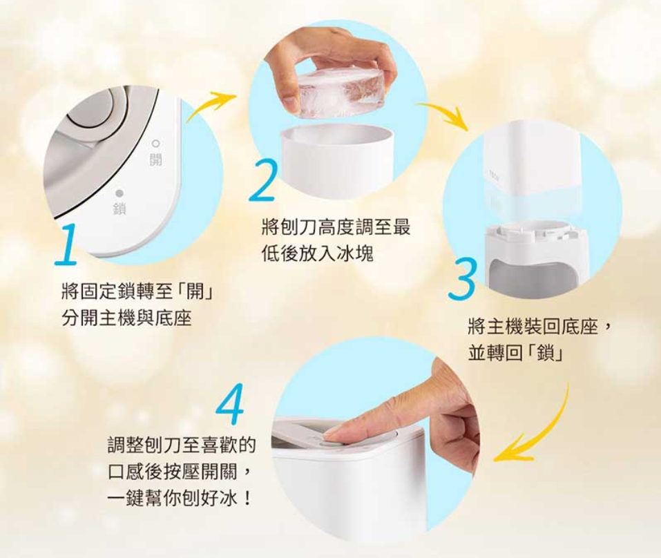 時尚的外型、優雅的白色,讓人很難第一眼就聯想到這是一台雪花冰機,放在桌上、廚房都不會覺得突兀。機體有清楚的指示可以旋開主機與底座,將主機的刨刀高度調整至最低,即可放入符合大小的冰塊,再將主機妝回底座,確認鎖好,選擇刨冰 / 雪花冰的口感,按壓開關,一鍵就能完成。