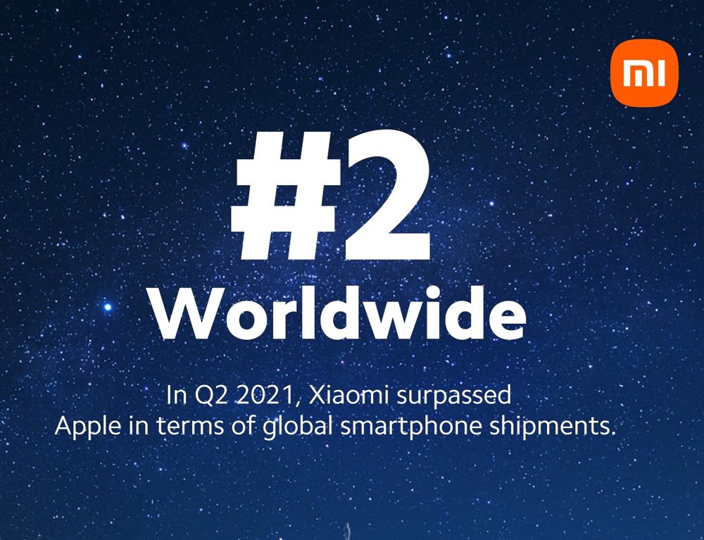 2020 年第四季,小米手機全球出貨量 4340 萬台,同比增長 31.5%,首次超越蘋果,重返全球第三。隨後的 2021 年第一季,蘋果以 15% 的市場份額升至全球第二,小米以 14% 的份額緊隨其後,其全球出貨量達到 4940 萬台,同比增長 69.1%。