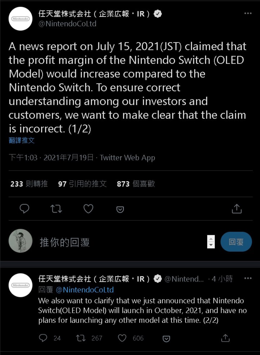 7 月 19 日,任天堂針對近日報導發推文澄清,表示公司暫時沒有新主機的計畫。同時也否認有報導稱 Switch OLED 款式「利潤比標準版主機更高」的說法。