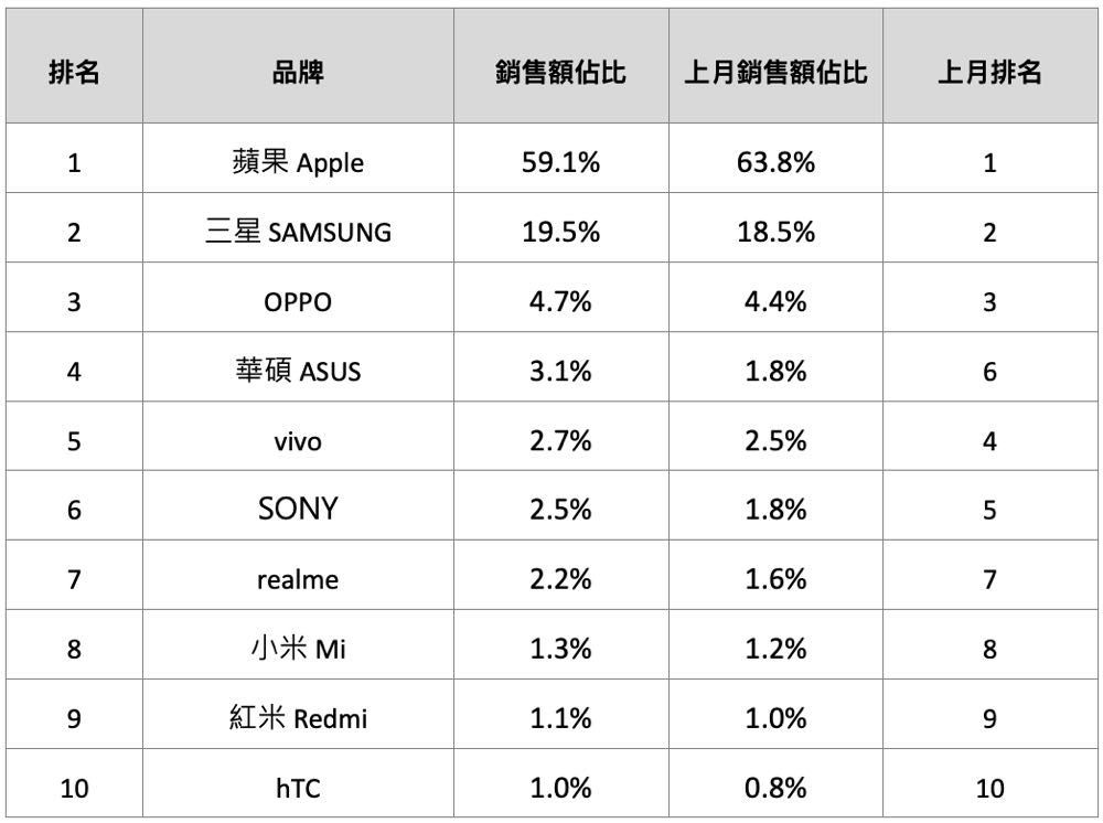 Apple 雖然依舊穩站排行榜首,但銷售額也從 63.8% 下降到 59.1%,成為此月排行榜中唯一數字下降的品牌。而在其他品牌數字增長之餘,比較特別的是華碩 ASUS 的 ZenFone 8 雖然對市佔沒有帶來太大影響,但銷售額卻也從 1.8% 躍升至 3.1%,表現算是相當亮眼。