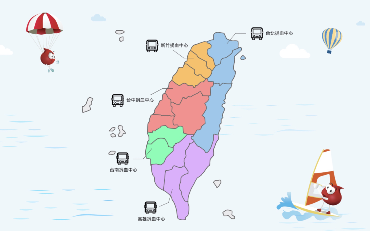 全台捐血中心分為台北、新竹、台中、台南、高雄,先選擇想要捐血的地區,點進去就能依照地圖或是位置來選擇最適合自己的捐血站。