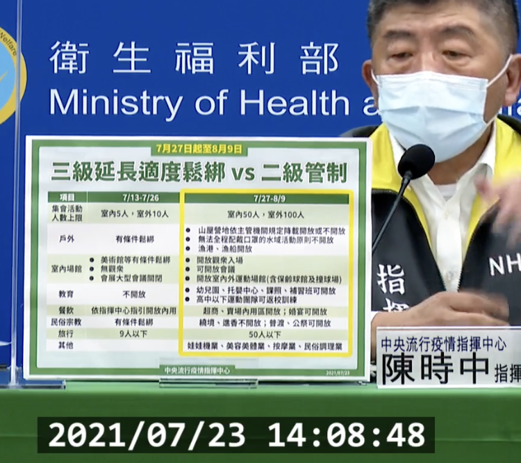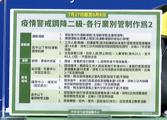 疫情指揮中心也列出三級延長適度鬆綁與二級管制的差異性,除了集會活動人數上限從室內 5 人、室外 10 人 改為 室內 50 人、室外 100 人,還有超商、賣場內用區、婚宴、普渡、公祭也都將在 7 月 27 日起開放,旅行方面人數從 9 人增至 50 人,許多家長們關心的托嬰、安親班、補習班也在 7 月 27 日開放!