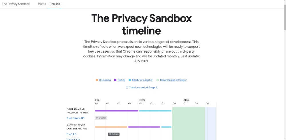 根據最新的計畫表,Privacy Sandbox 將以「打擊網路上垃圾郵件與詐欺」、「顯示相關內容與廣告」、「衡量數位廣告」、「強化跨站隱私邊界」逐步進行測試。最快於 2022 年第 4 季進入淘汰 Cookie 的第一個過渡階段;2023 年底前,淘汰第三方 Cookie。