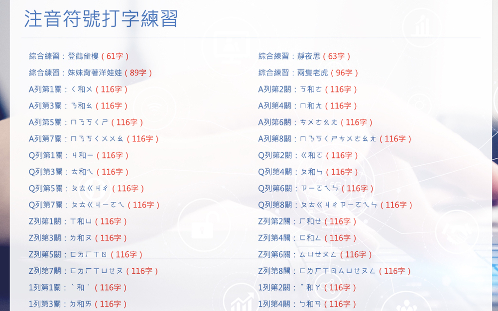 如果家裡有正在練習打字或注音的小朋友,《花蓮縣打字練習網》還有顯示手指位置圖可以給小朋友參考,再選注音練習範本,其中有單純的 Q 列、A 列注音,或是直接選一個練習範本來打注音!