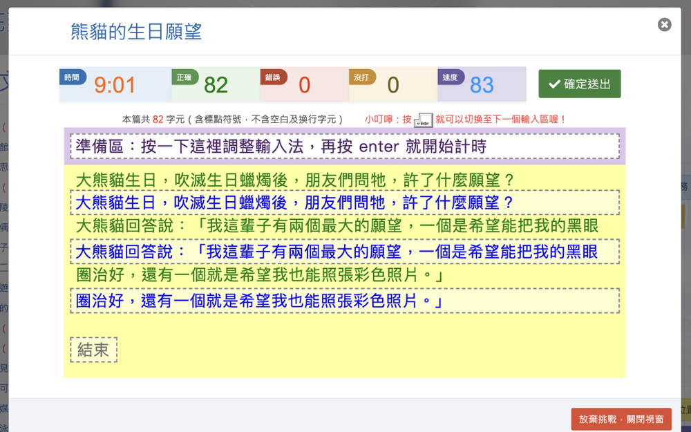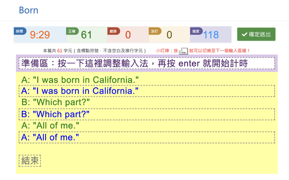 選好想練習的範本,就能在下方空白處開始輸入,每個對照的位置會有粉紅色的反白,要注意的是連標點符號、空格也都會算在字元裡面。游標移到打字區後系統就會開始計算時間,打字過程中也會把自己打對、打錯的字顯示在上頭。打完後按下「結束」就可以送出自己的成績。