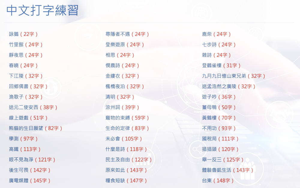 如果選擇中打練習,《花蓮縣打字練習網》提供了大家熟悉的《竹里館》、《靜夜思》…等古詩,還有一些小短句,字數從 22 字到 100 多字的範本都有。