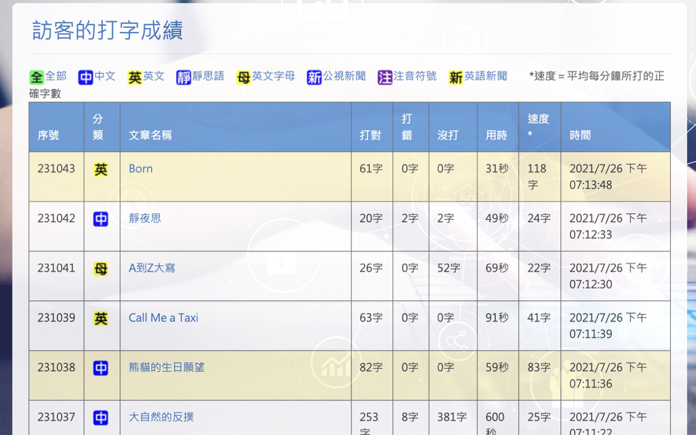 然後便會看到「訪客的打字成績」顯示著所有在練習網上練習的成績,自己的成績會用黃色的底色顯示,給自己參考。