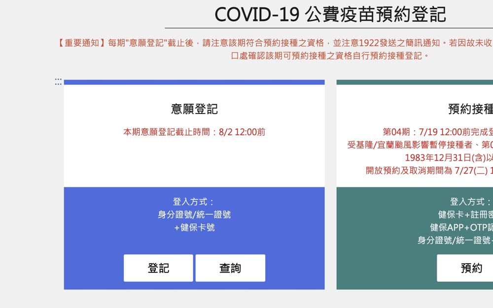 7 月 27 日上午 10:00 開放第四輪疫苗預約,由於僅提供 AZ 疫苗選項也讓稍早在填寫意願登記時僅填莫德納的民眾陷入無法施打也無法更改意願的窘境。對此中央疫情指揮中心在 27 日下午宣布將自 27 日下午 2:00 重新開放意願登記,18 歲 (含) 以上尚未進行意願登記,或是對之前的疫苗選擇想要更改的朋友,都能把握機會進行登記,此次開放也新增接種高端疫苗選項,提供 20 歲以上民眾選擇。