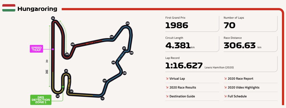 2021 F1 賽事將於 8 月 1 日進入匈牙利站,位於布達佩斯的匈格羅寧賽道有著狹窄多彎的特點,因此車手在這裡很難進行超車,也算是相當有挑戰性。匈牙利站維持週五車手練習賽、週六排位賽與週日正式賽的節奏(沒有衝刺賽)。