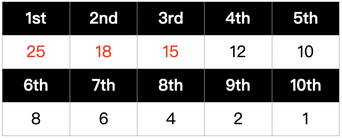 每場大賽冠軍車手可獲得 25 分積分,第十名可獲得1分積分,前十名完賽的車手還可爭取決賽最快單圈(Fastest Lap)的 1 分積分。
