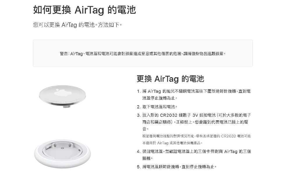 根據蘋果支援頁面,消費者更換 AirTag 的電池,需將拋光不鏽鋼電池蓋往下壓,再逆時針旋轉,取下電池蓋與電池,並且換上新的 CR2032 鋰離子 3V 鈕扣電池,若電池已接上會聽到聲音。但頁面上一排小字提醒,並非每種 CR2032 電池都適用於 AirTag: