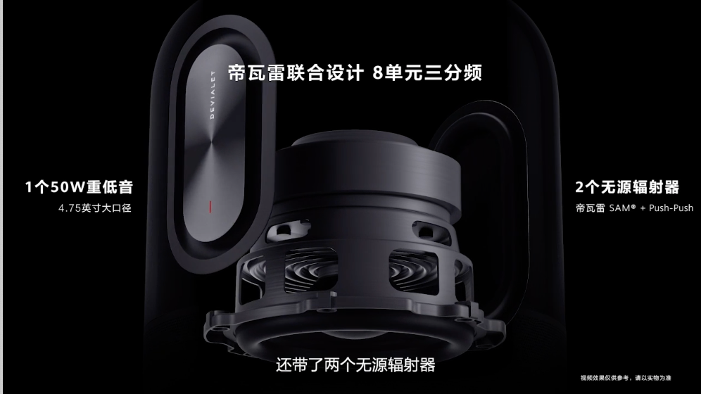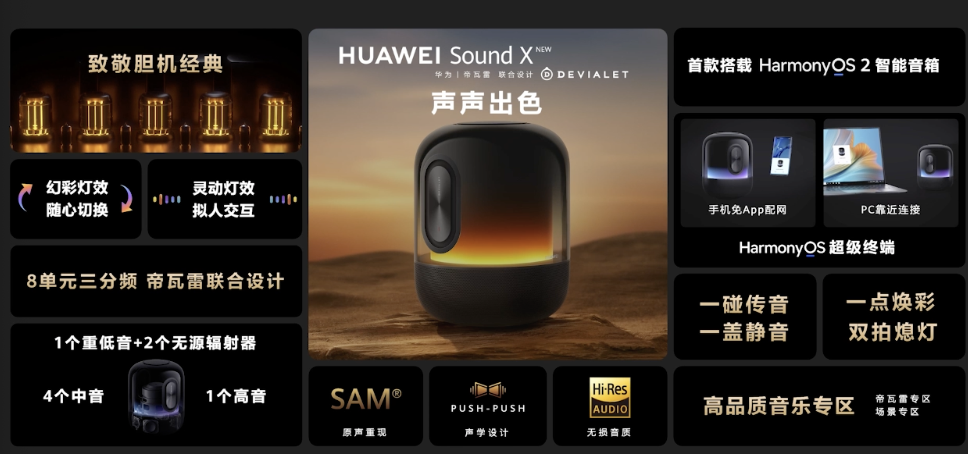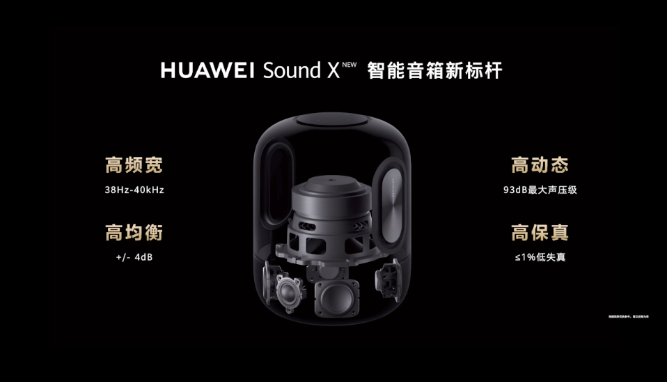 華為 萬象新生發表會除了 P50 系列新機外,還有新一代的 Huawei Sound X 智慧喇叭,繼續與帝瓦雷合作,支援多重色彩燈效, 3W 高音喇叭、4 個中音喇叭與一個 50W 低音喇叭,並支援HarmonyOS 。