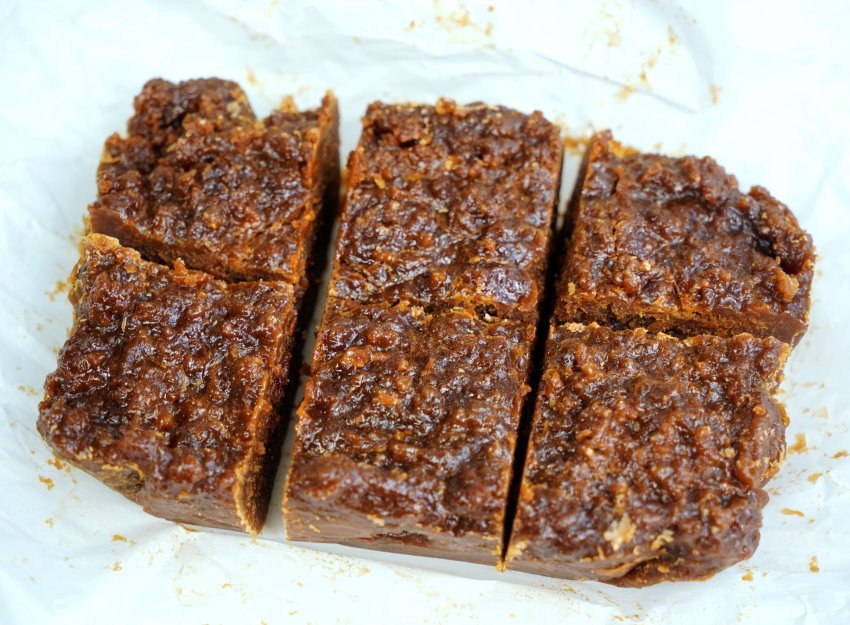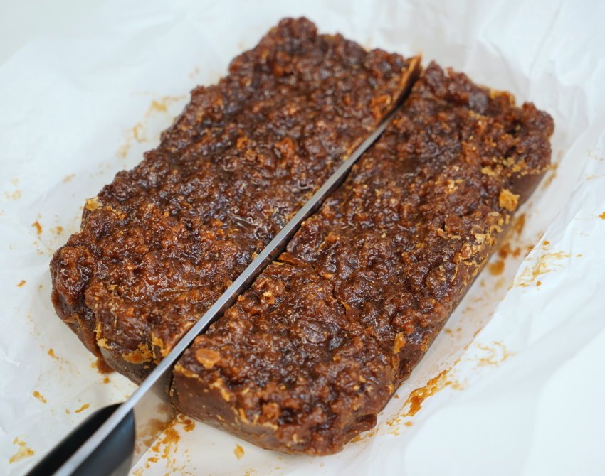 ▼放個5~10分鐘,等到隔著烘焙紙摸起來不燙手的時候就可以趁熱將冬瓜茶磚切成小塊,記得不要等到全涼再切,就會硬到切不下去啊!!