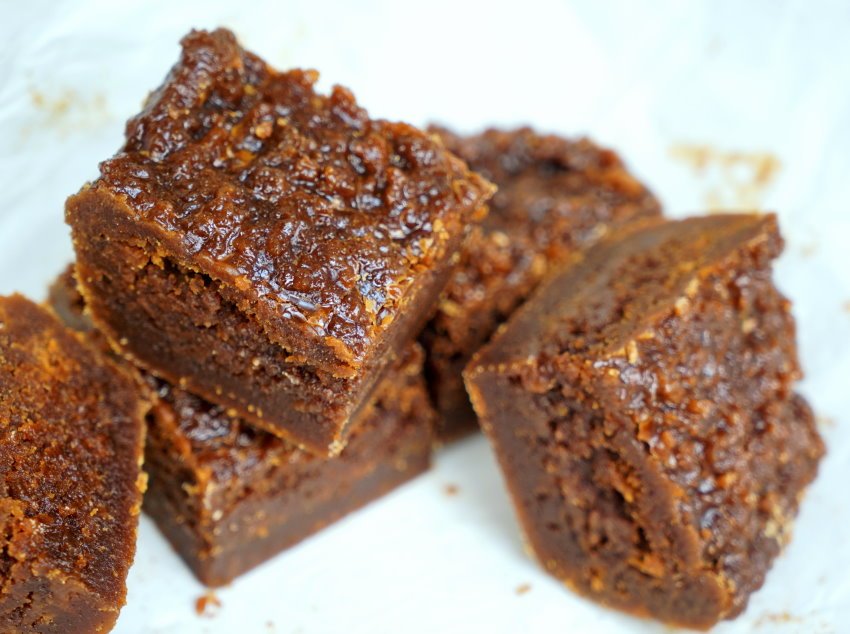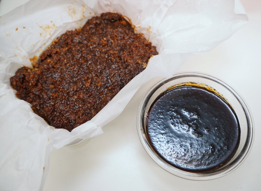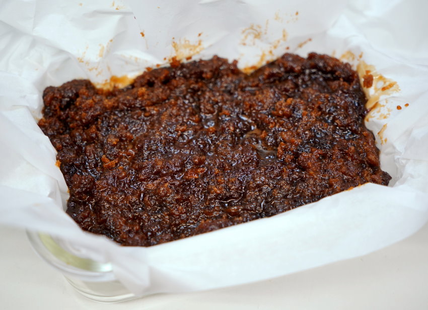 5.另外將烘焙紙鋪在容器中,趁熱將冬瓜糖蜜倒入容器中塑形。